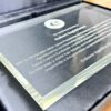 Acrilico grueso de 25 mm espesor, se sostiene solo sobre escritorio, tipo TOTEM. Con inclusion de bronce