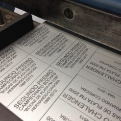 Chapa sola grabada aluminio base oro o plata con grabado en negro. El precio es por cm2. Al completar el largo y el alto el precio sera modificado automáticamente.
