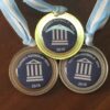 Medalla de 32 mm de diámetro.Bordes con laureles, puntitos o guarda griega. Sticker full color con resina. Base plateada.