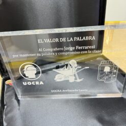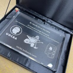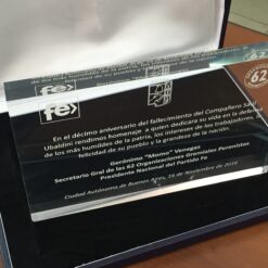 Placa de Acrilico Cristal de 25 mm espesor, se sostiene solo sobre escritorio por su grosor. Grabado personalizado de texto o logo. Pieza con cantos pulidos, presentada en estuche