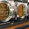 Placa de Acrilico Cristal de 25 mm espesor, se sostiene solo sobre escritorio por su grosor. Grabado personalizado de texto o logo. Pieza con cantos pulidos, presentada en estuche.