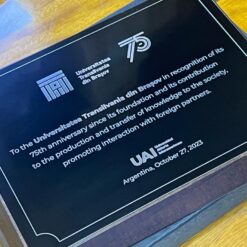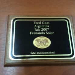 Plaqueta base de madera lustrada oscura de 2.5 cm espesor con placa de aluminio base negra y letras en oro o plata . Opcional botones metálicos en las esquinas.