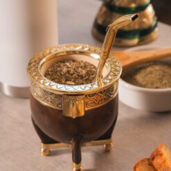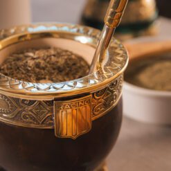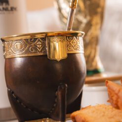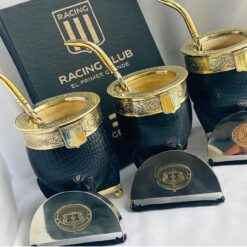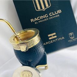 Este producto es perfecto para los fanáticos del club de fútbol RACING CLUB DE AVELLANEDA. Este mate es cuidadosamente seleccionado, realizado en calabaza natural y forardo en cuero vacuno, con pie y bolitas de bronce oro que le brindan un aspecto elegante y de alta calidad. Además, cuenta con el Escudo de Racing en dorado, lo que lo convierte en un artículo de colección para los verdaderos seguidores del equipo.