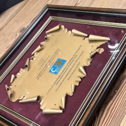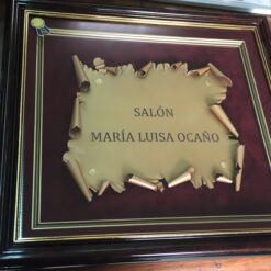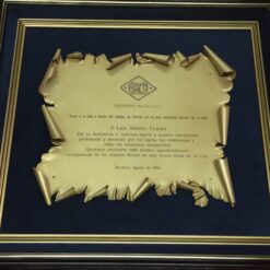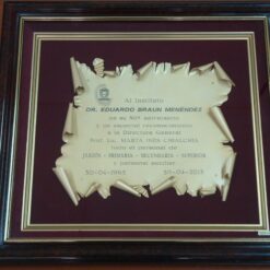 Vitrina con vidrio y batea, con placa de bronce apergaminada doble, con ribete, personalizada